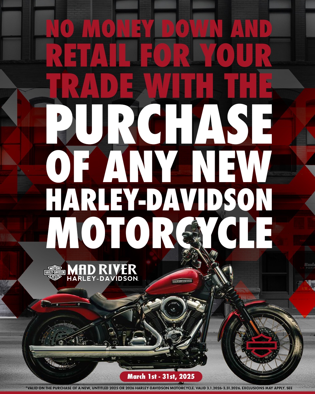 Get into a new Harley-Davidson® motorcycle with no money down and get retail value for your trade at Mad River Harley-Davidson. It’s never been easier to make your move.